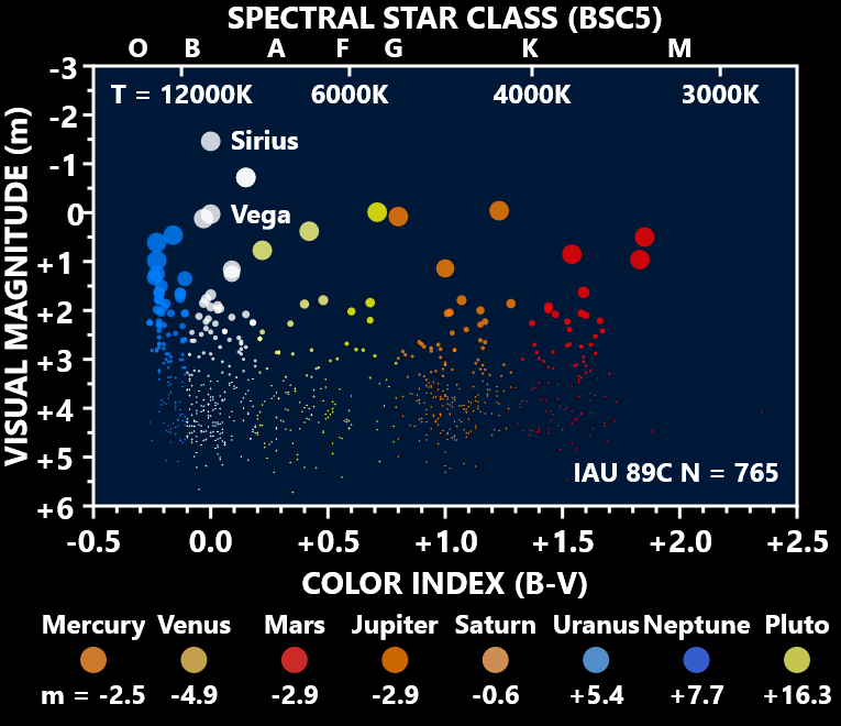 The stars and planets are color coded. The above shows the Hertzsprung - Russel diagram used.