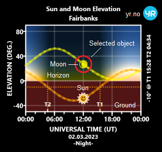 The background sky illuminance is calculated by the Perez formula.[14] Zenith and clear skylight distribution coefficients are from Preetham et al. (1999).[15] The local calculated global irradiance perpendicular to the sun’s rays at sea level is based on experimental work by Kasten and Young (1989) [16] and Meinel (1976).[17] The effective shadow height of Earth is calculated for twilight conditions by Lloyd (1968).[18] The altitudes are calculated for zenith observations. The Yr.no hyperlink points to the weather forecast map service by YR which is served by the Norwegian Meteorological Institute (NMI) and the Norwegian Broadcasting Corporation (NRK). |