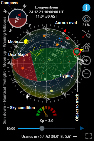 Start the app and locate the auroral oval. If you have a clear view of the oval above your head, seen in the Aurora Compass,